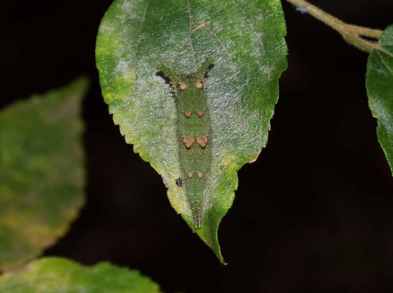 アカボシゴマダラの幼虫(ムシムシ探検隊通称:アーちゃん)も、エノキの若木の葉に、そっととまっていました。