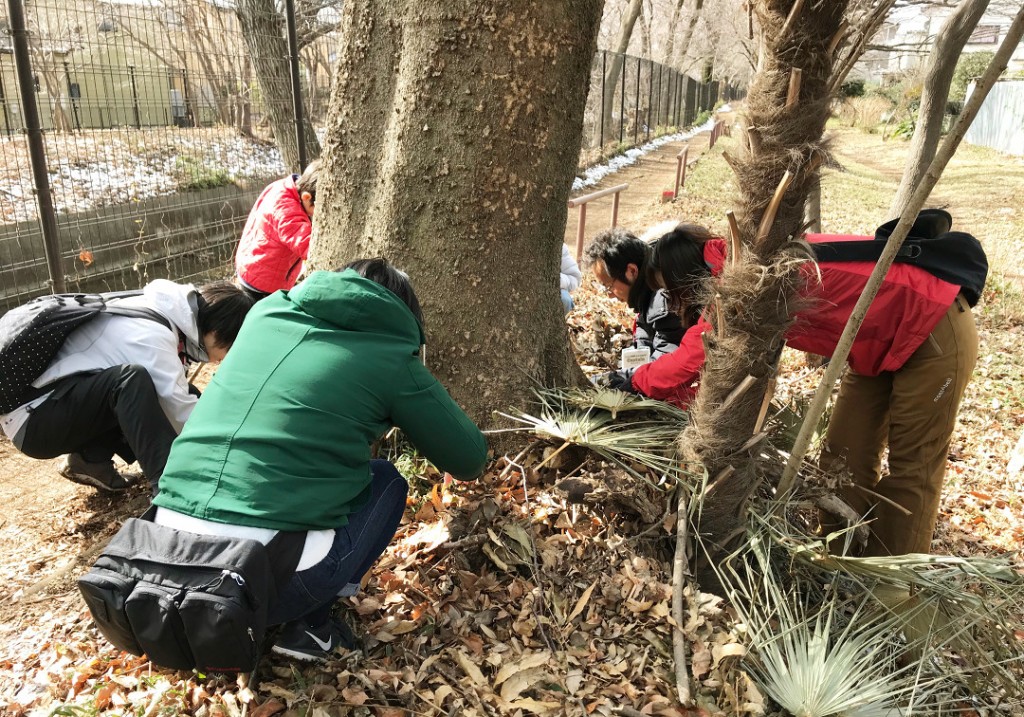 参加者もみんなでエノキの木のまわりにしゃがみこんで、エノキの木の葉っぱを一枚一枚ていねいに探します。